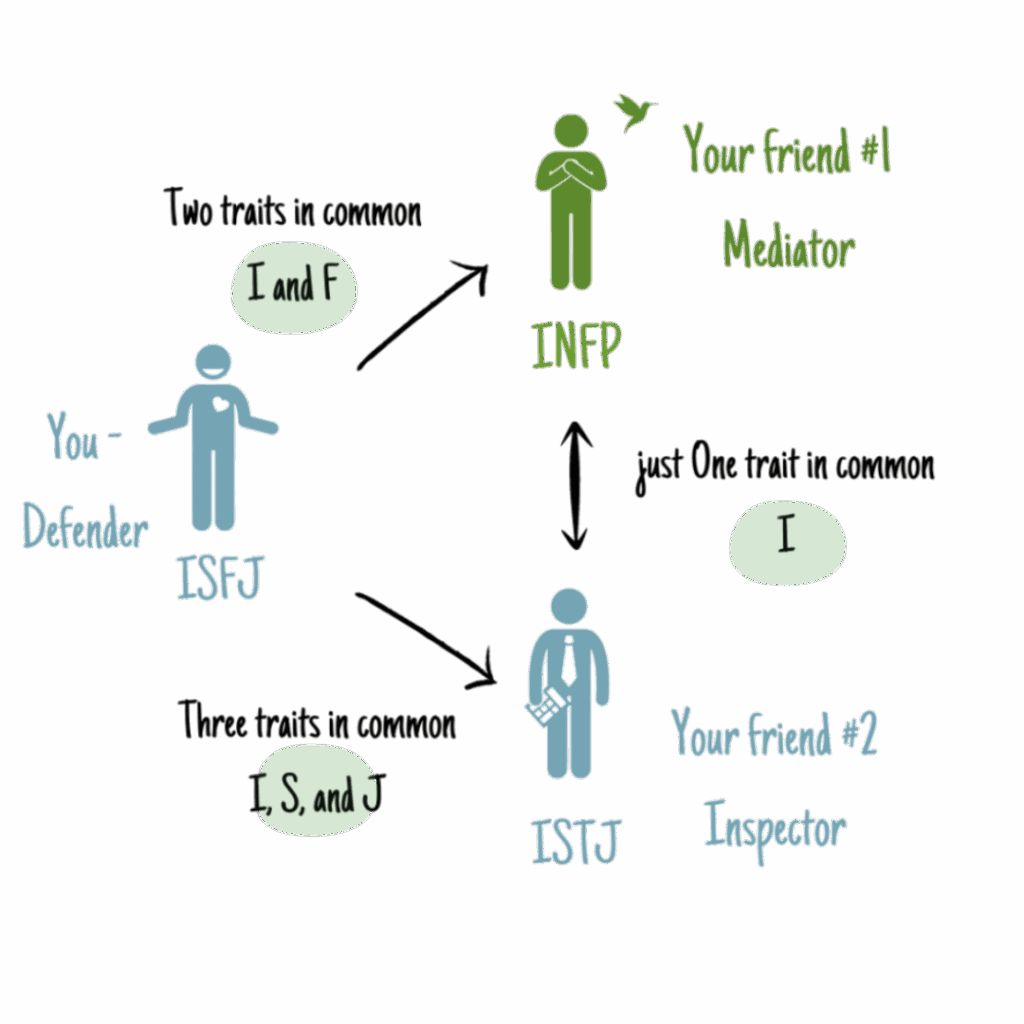 Each personality type can be represented by the combination of 4 different “core” traits. It’s very good to have at least 2 traits in common – then you have enough things in common to get on well, but enough differences between each other to sustain a healthy balance. So then, when you’re a Defender (ISFJ), for example, and your two best friends are an Inspector (ISTJ) and a Mediator (INFP), then as you can see, you share 3 traits with an Inspector – you’re both Introverts (I), you focus on facts (S) and you are organised (J). With a Mediator, you share 2 traits – you’re both Introverts (I) and you prefer following your feelings (F) to following your sense. That’s why you get on fine with each of your pals.